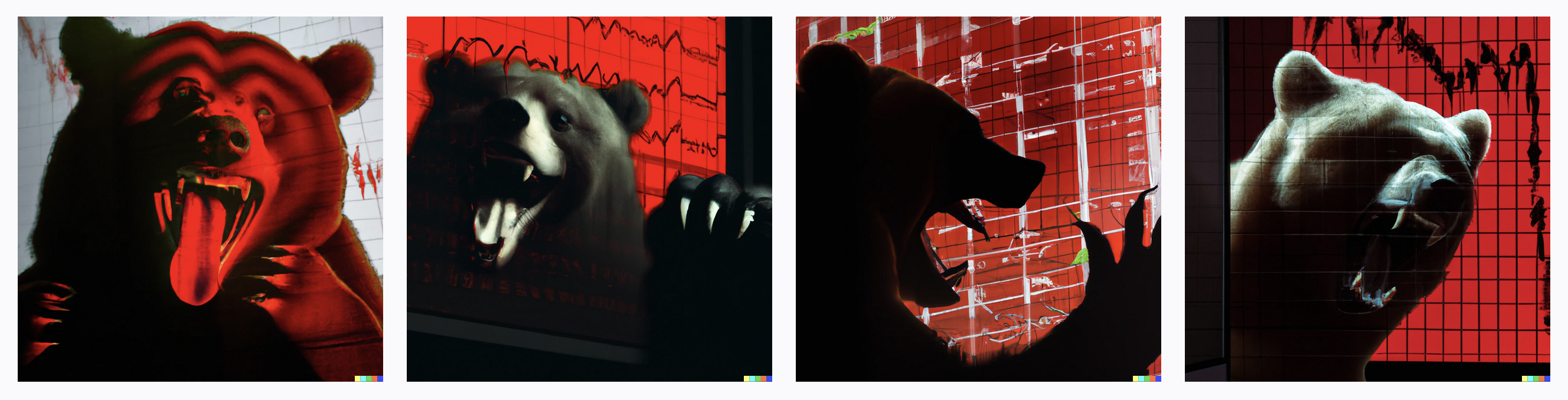 During the process of learning how to talk to it, I shared some images with one of my favorite business-oriented internet forums. The query for the second row of images was"evil bear laughing maniacally from the shadows as he hides behind a transparent computer screen displaying stocks with downwards trends in red"