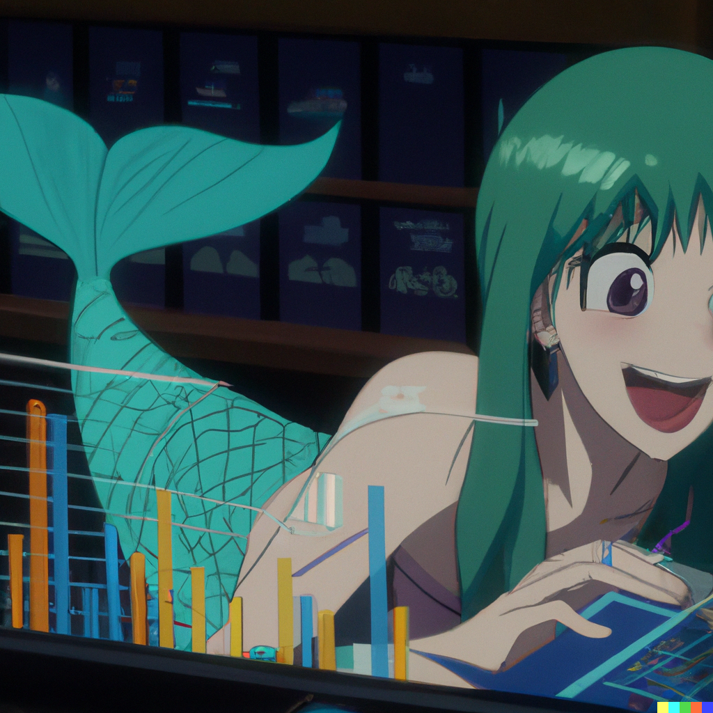 Instead of generic laughing mermaids, I got something really cool back. Now it does look "AI-ish", but so does everything examined up close from OpenAI DALL·E. The query used reads; "Screenshot of the mermaid laughing at sales charts on a computer screen from the movie Mermaid Stock Trader by Hayao Miyazaki". OpenAI DALL·E can be nudged to draw more complex or rich imagery, by describing something as if it was a photo or screenshot that really exists. Presumably, that's how it was trained!