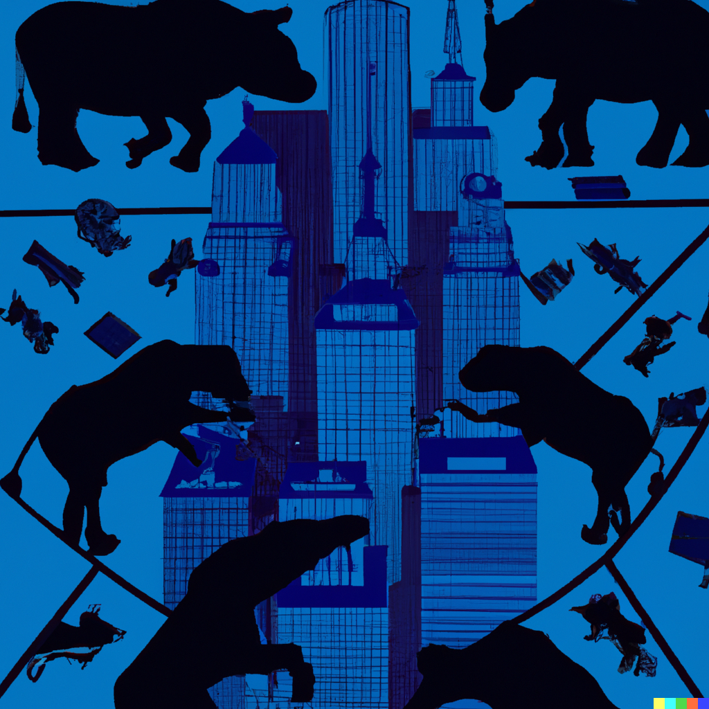 "Cross section of new york, upper part is wall street, lower part bulls and bears in masks stealing bags of money, night sky blue tint"